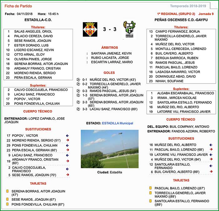 Encuentro correspondiente a la jornada 9 de liga, celebrado el día 4 de noviembre de 2018, a las 15:45 horas en el Municipal de Estadilla. Terreno de juego en regular estado con la hierba alta.