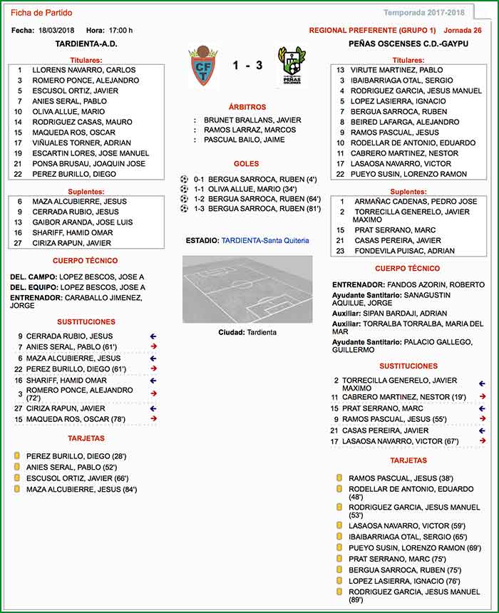 Encuentro correspondiente a la jornada 26 de liga celebrado el día 18 de marzo de 2018, a las 17 horas en el Santa Quiteria de Tardienta.
