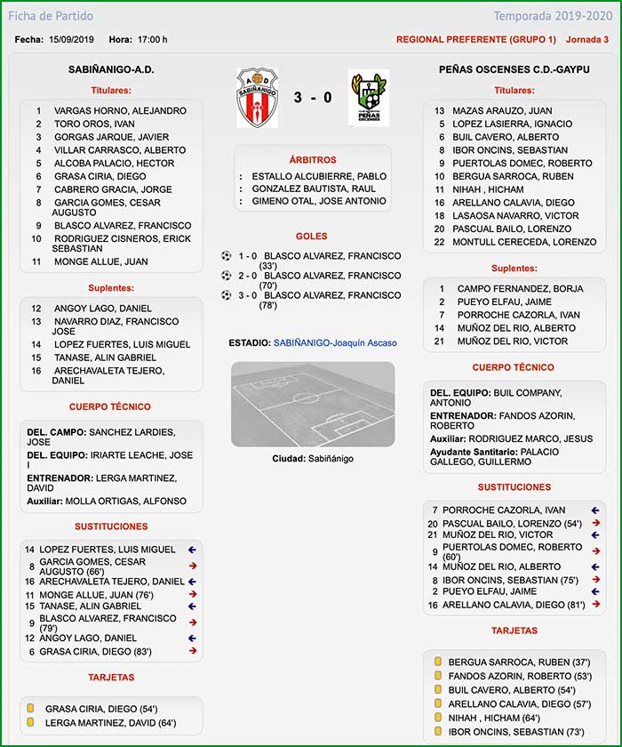 Encuentro correspondiente a la jornada 3 de liga celebrado el día 15 de setiembre de 2019, a las 17 horas en el Joaquín Ascaso de Sabiñánigo. Tarde nublada y ligera lluvia en algunos momentos del encuentro.