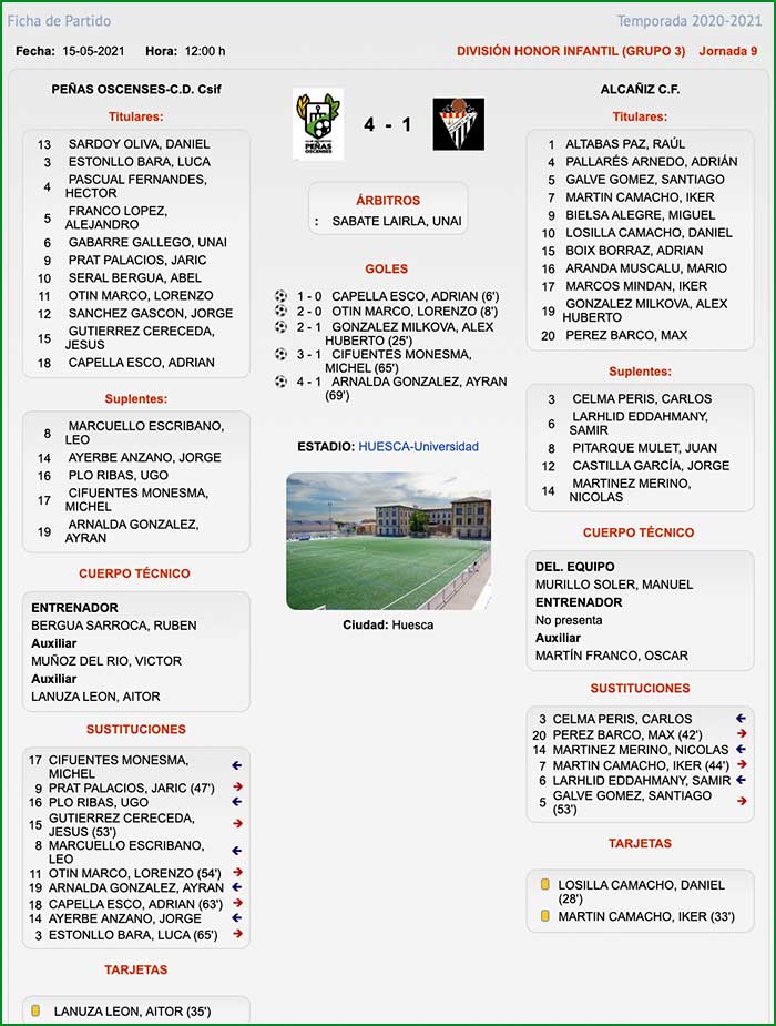 Encuentro correspondiente a la jornada 9 de liga celebrado el día 16 de mayo de 2021, a las 12 horas en el campo de la Universidad en Huesca.