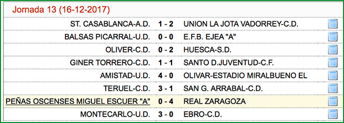 Encuentro correspondiente a la jornada 13 de liga celebrado el día 16 de diciembre de 2017, a las 10:30 horas en el campo 2 del C.M.F. de San Jorge de Huesca.