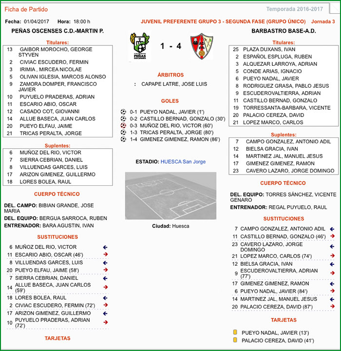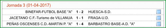 Encuentro correspondiente a la jornada 3 de la Segunda Fase de la Liga, celebrado el día 1 de abril de 2017, a las 18 horas en el C.M.F. San Jorge de Huesca, con viento que dificultó el juego.