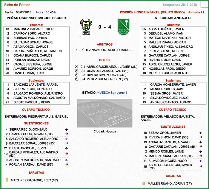 Encuentro correspondiente a la jornada 21 de liga celebrado el día 3 de marzo de 2018, a las 10:45 horas en el campo 1 del C.M.F. San Jorge de Huesca.