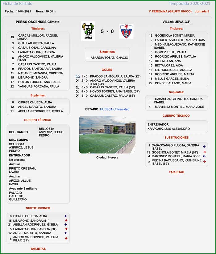 En los primeros 10 minutos inquietó algo en Villanueva, pero después el Peñas Oscenses CLIMETEL fue el dominador total del encuentro y ganó con los goles el primero de la tarde de penalti lanzado por Laura Prados en el minuto 22.