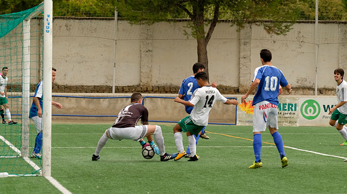 El Biescas intenta aprovechar algún error de los locales y lo consigue en el minuto 35, un balón rechazado le llega a Dylan que casi sin ángulo inaugura el marcador.