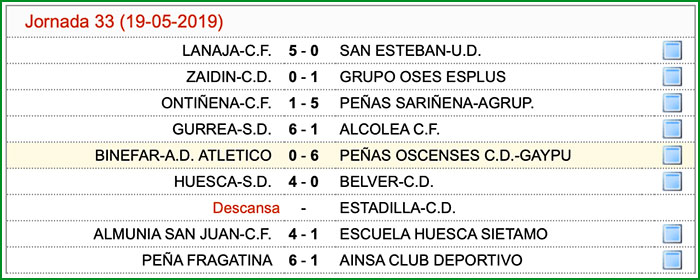 Encuentro correspondiente a la jornada 33 de liga, celebrado el día 19 de mayo de 2019, a las 18 horas en el Nuevo Los Olmos de Binéfar.