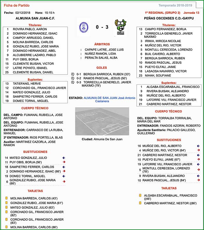 Encuentro correspondiente a la jornada 13 de liga celebrado el día 2 de diciembre de 2018, a las 15:15 horas en el José Antonio Castanera de Almunia de San Juan.