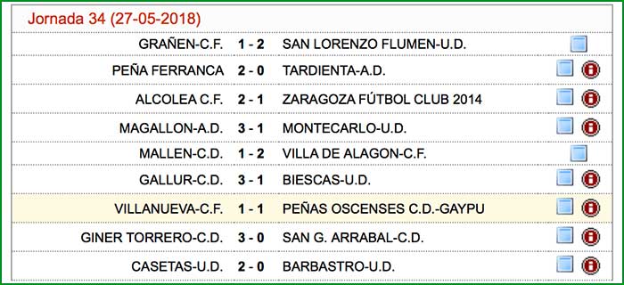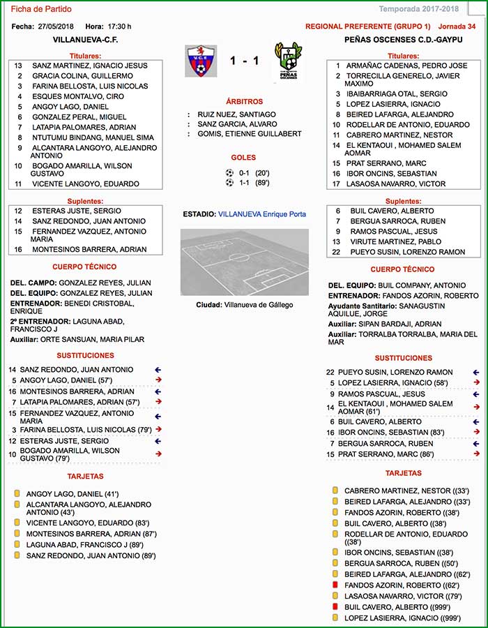 Encuentro correspondiente a la jornada 34 y última de liga celebrado el día 27 de mayo de 2018, a las 17:30 horas en el Enrique Porta de Villanueva de Gállego.