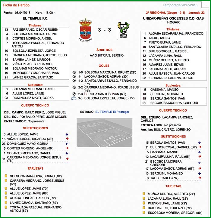 Partido jugado el día 8 de abril de 2018,a las 18 horas en el Pedregal de El Temple, con buena temperatura y campo en excelente estado.