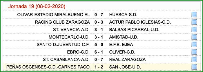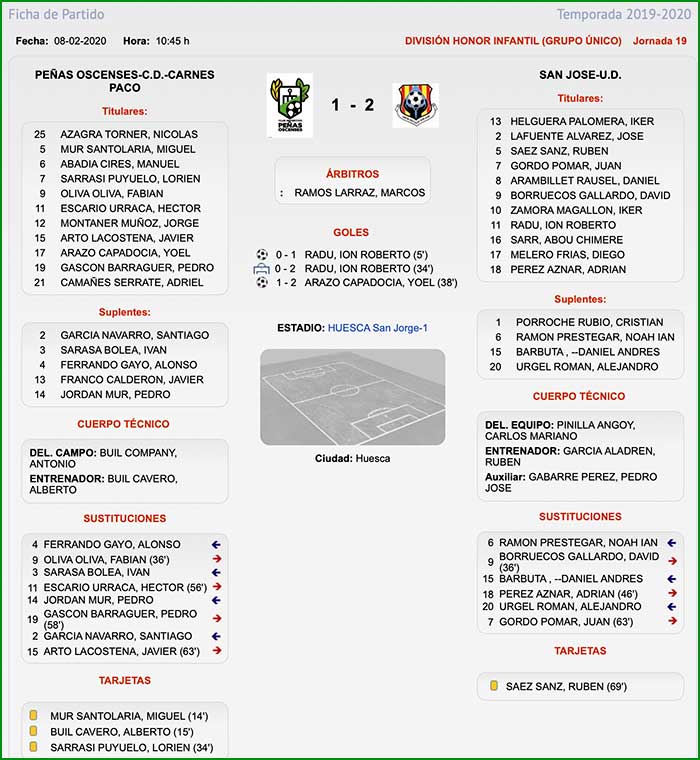Encuentro correspondiente a la jornada 19 de liga, celebrado el día 8 de febrero de 2020, a las 10:45 horas en el campo 1 del C.M.F. San Jorge de Huesca.