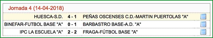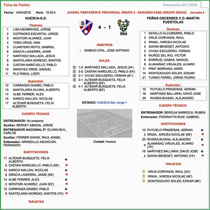 Encuentro correspondiente a la jornada 4 de la fase de ascenso juvenil, celebrado el día 14 de abril de 2018 en Huesca San Jorge-1, a las 15:30 horas.
