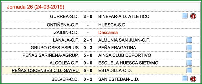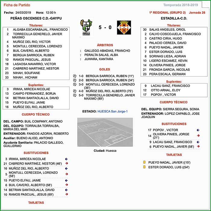 Encuentro correspondiente a la jornada 26 de liga, celebrado el día 24 de marzo de 2019, alas 12 horas en el campo 1 del C.M.F. San Jorge de Huesca.
