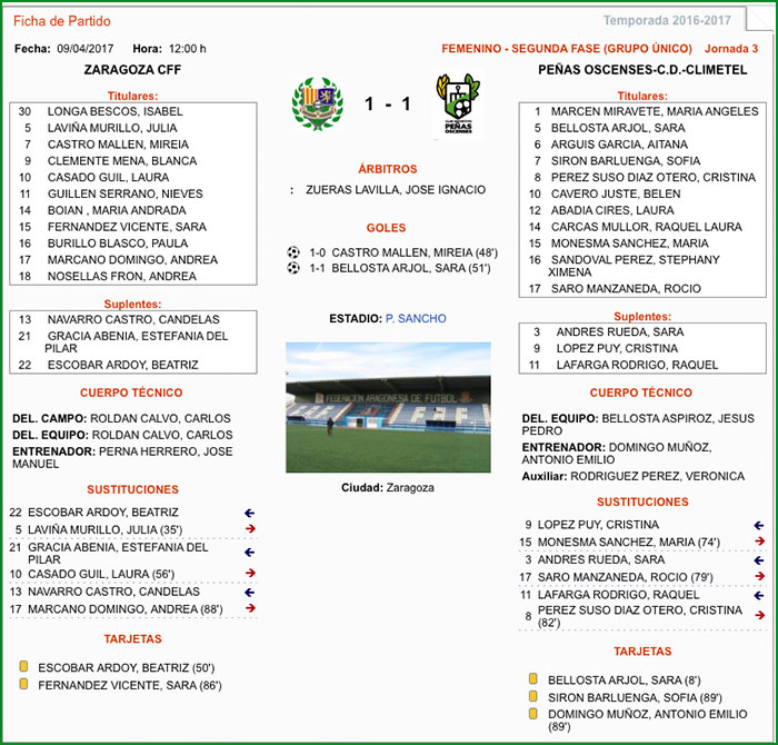 Liga Segunda FaseZaragoza CFF |1 – 1| C.D. Peñas Oscenses-CLIMETEL
