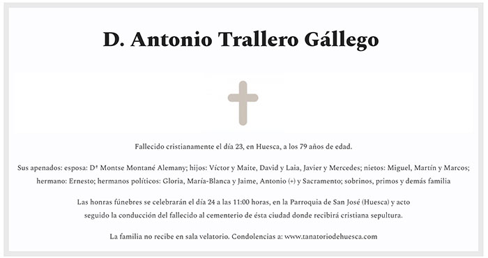 Desde el Club Deportivo Peñas Oscenses os queremos comunicar que hoy 23 de febrero de 2021 ha fallecido Antonio Trallero Gállego que fue entrenador del Peñas en varias temporadas.
