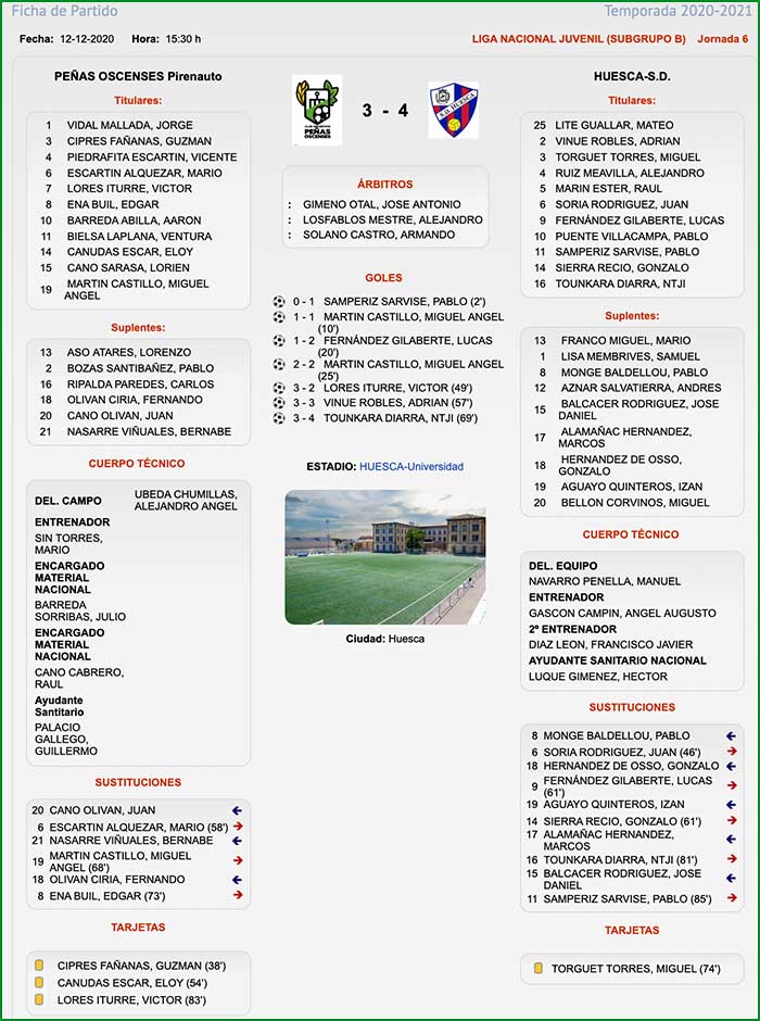 Encuentro correspondiente a la jornada 6 de liga 2020-2021, celebrado el día 12 de diciembre de 2020 a las 15:30 horas en el campo de la Universidad, bajo la dirección del colegiado José Antonio Gimeno ayudado en las bandas por Alejandro Losfablos y Armando Solano.