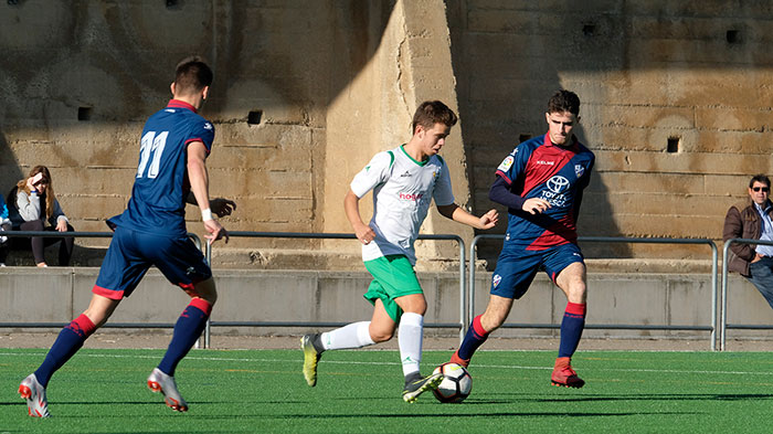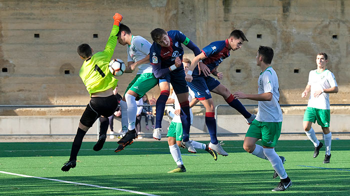 Gracias a la altura de muchos de sus jugadores, el Huesca crea peligro en varios saques de esquina. En uno de ellos marca con fortuna el 2-3, tras pegar el balón de forma involuntaria en la pierna del jugador y despistar a Jorge.