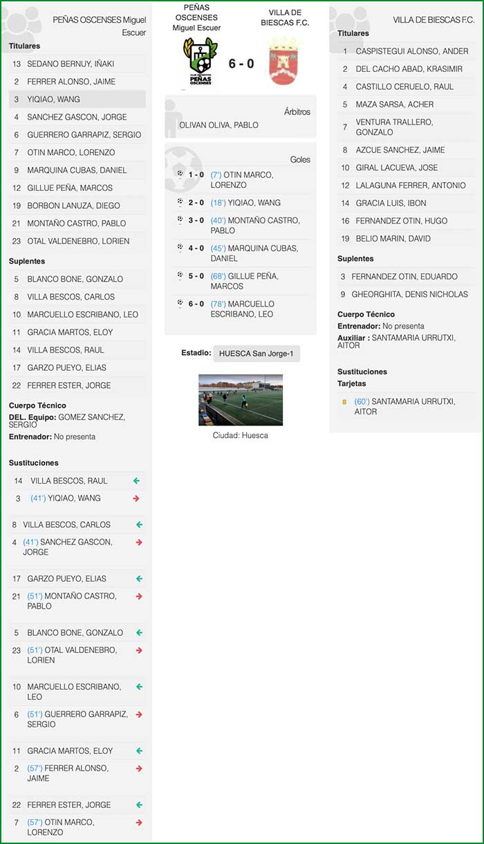 Los goleadores por el Peñas fueron Lorenzo Otín (1-0 min.7), Wang Yiqiao (2-0 min. 18), Pablo Montaño (3-0 min. 40), Daniel Marquina (4-0 min.46), Marcos Gillue (5-0 min. 68) y Leo Marcuello (6-0 min. 78).