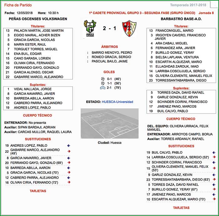 Partido correspondiente a la jornada 8 de la segunda fase de primera cadete provincial del grupo 3 que enfrentaba al Peñas Oscenses Volkswagen y al Barbastro Base –A.D. en el campo de la Universidad.