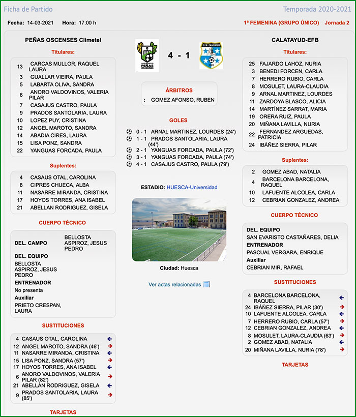 El Peñas Oscenses-CLIMETEL logró la victoria (4-1) en el primer partido de liga ante el Calatayud, en un encuentro que estuvo marcado por un viento que apenas permitió que las jugadoras de ambos equipos realizarán largas combinaciones de pases sobre todo en la primera mitad.