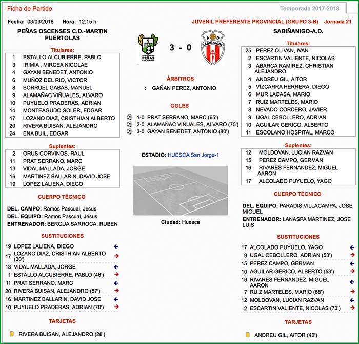 Encuentro correspondiente a la jornada 21 de liga (Juvenil Preferente Provincial/Grupo 3-B), celebrado el día 3 de marzo de 2018 en Huesca San Jorge-1, a las 12:15 horas.