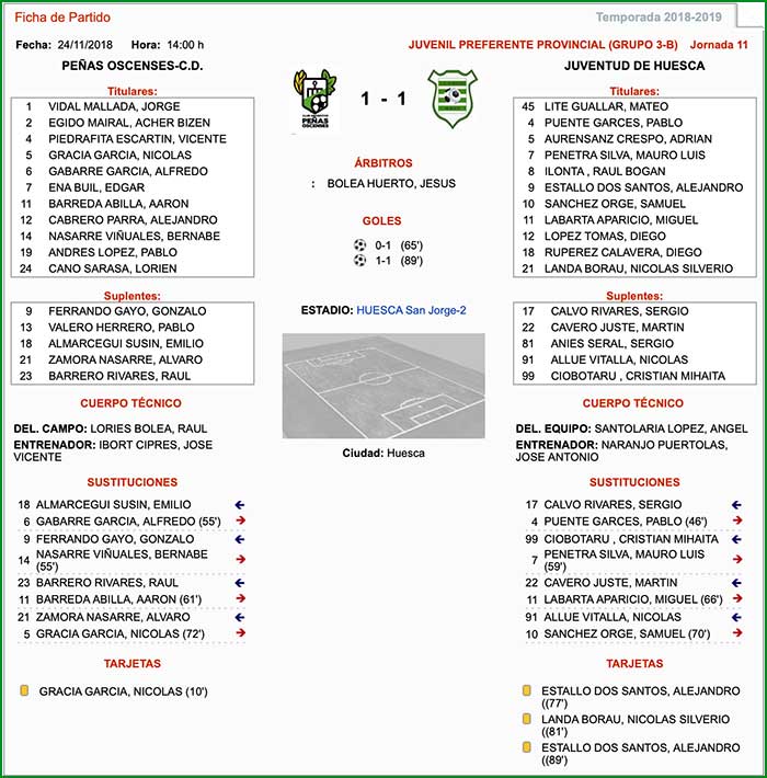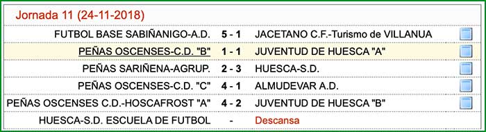 Encuentro correspondiente a la jornada 11 de liga, celebrado el día 24 de noviembre de 2018 a las 14 horas en el campo 2 del C.M.F. San Jorge de Huesca.