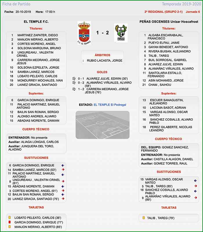 Encuentro correspondiente a la jornada 6 de liga, celebrado el día 20 de octubre de 2019, a las 17 horas en El Pedregal de El Temple.