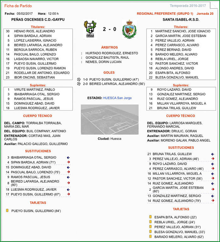 Encuentro correspondiente a la jornada 20 de liga, celebrado el día 5 de febrero de 2017, a las 12 horas en el C.M. F. de San Jorge de Huesca.